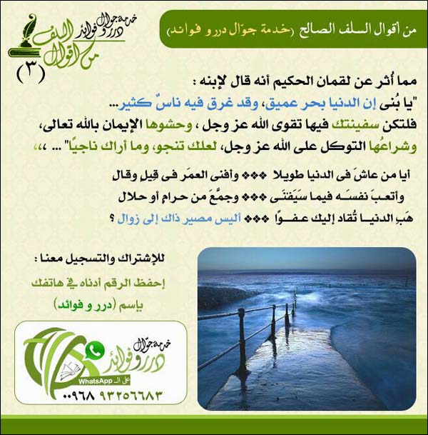 » من أقوال السلف [3]: إن الدنيا بحر عميق ، وقد غرق فيه ناس كثير .. فلتكن سفينتك فيها تقوى الله عز وجل وحشوها الإيمان بالله تعالى ، وشراعها التوكل على الله عز وجل