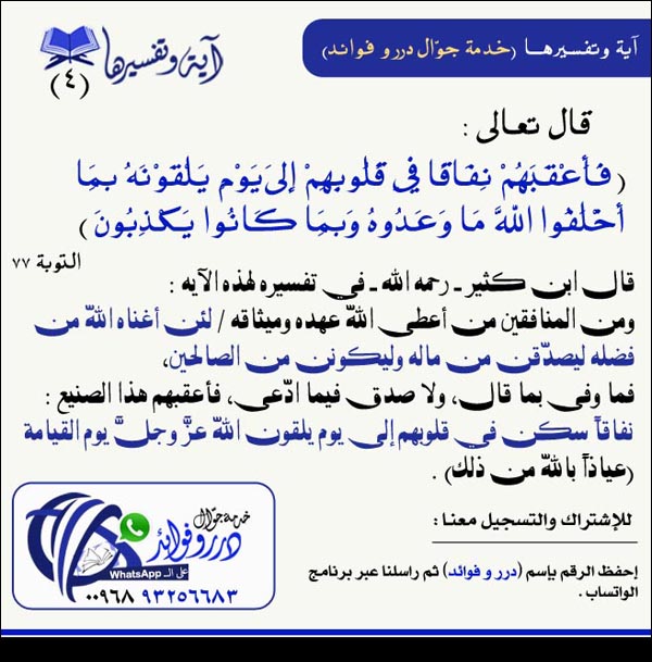 عنوان المقال: » آية وتفسيرها [4]: (فأعقبهم نفاقاً في قلوبهم إلى يوم يلقونه بما أخلفوا الله ما وعدوه وبما كانوا يكذبون)