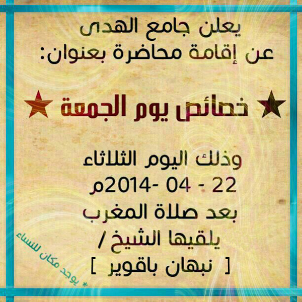 » ستقام محاضرة للشيخ نبهان بن أحمد باقوير (خصائص يوم الجمعة) بجامع الهدى بصلالة الجديدة الثلاثاء 4/22 بعد صلاة المغرب .. يوجد مكان للنساء