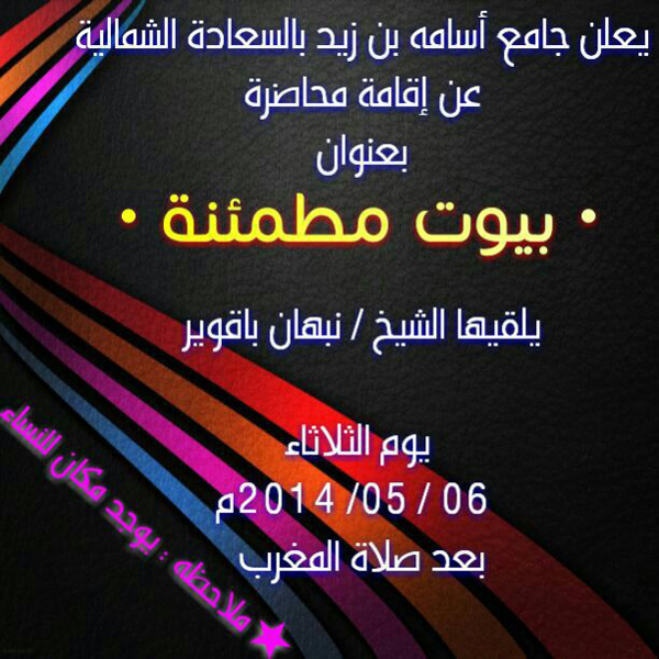 » ستقام الليلة الثلاثاء 5/6 محاضرة للشيخ نبهان بن أحمد باقوير (بيوت مطمئنة) بجامع أسامة بن زيد بالسعادة الشمالية بعد صلاة المغرب .. يوجد مكان للنساء