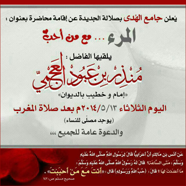 عنوان المقال: » ستقام محاضرة للشيخ منذر العجمي (المرء مع من أحب) بجامع الهدى بصلالة الليلة (الثلاثاء 5/13) بعد صلاة المغرب .. يوجد مكان للنساء