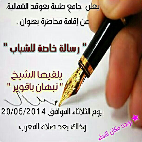 عنوان المقال: » محاضرة للشيخ نبهان باقوير (رسالة خاصة للشباب) بجامع طيبة بعوقد الشمالية الليلة (الثلاثاء 5/20) بعد صلاة المغرب .. يوجد مكان للنساء