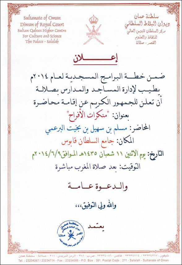 عنوان المقال: » محاضرة للشيخ مسلم البرعمي (منكرات الأفراح) بجامع السلطان قابوس بصلالة الاثنين 6/9 بعد صلاة المغرب مباشرة.. والدعوة عامة