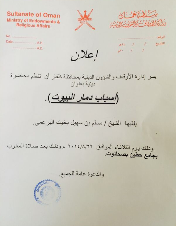 عنوان المقال: » محاضرة للشيخ مسلم البرعمي (أسباب دمار البيوت) بجامع حطين بصحلنوت الثلاثاء 8/26 بعد صلاة المغرب .. يوجد مكان للنساء