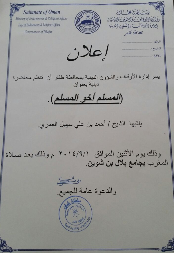 عنوان المقال: » محاضرة للشيخ أحمد العمري (المسلم أخو المسلم) بجامع بلال بن شوين الليلة الاثنين 9/1 بعد صلاة المغرب مباشرة.. والدعوة عامة