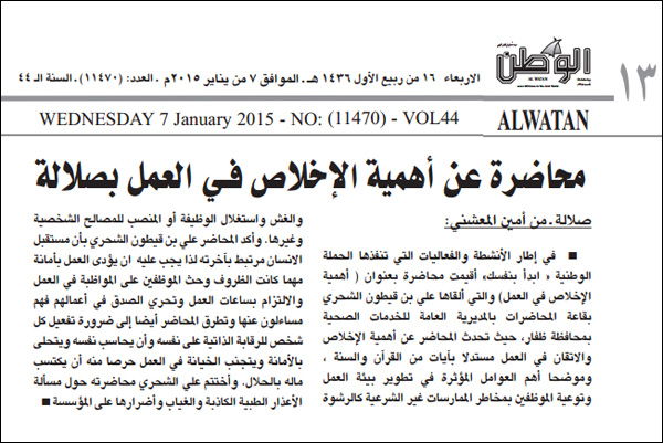 عنوان المقال: » [الوطن] محاضرة عن أهمية الإخلاص في العمل بصلالة ..